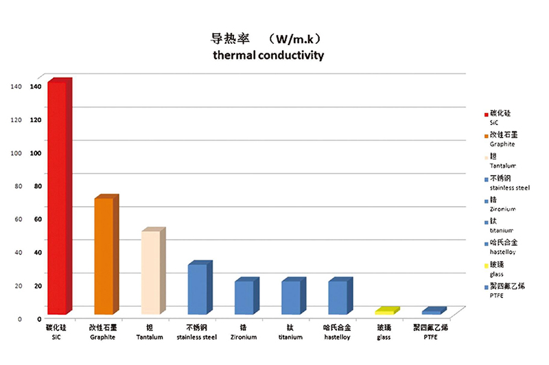 (2)高導熱性能:與玻璃設備相比,通過高效的換熱材料及結構,碳化硅換熱器可減少超過50%的換熱面積。
